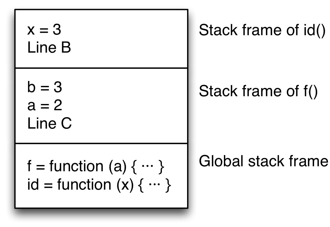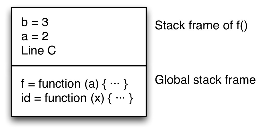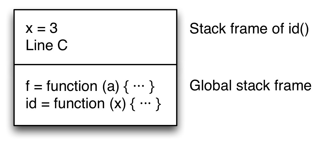 There are now two frames on the stack: One for the global scope (bottom) and one for f() (top). f’s stack frame includes the return address, line C.