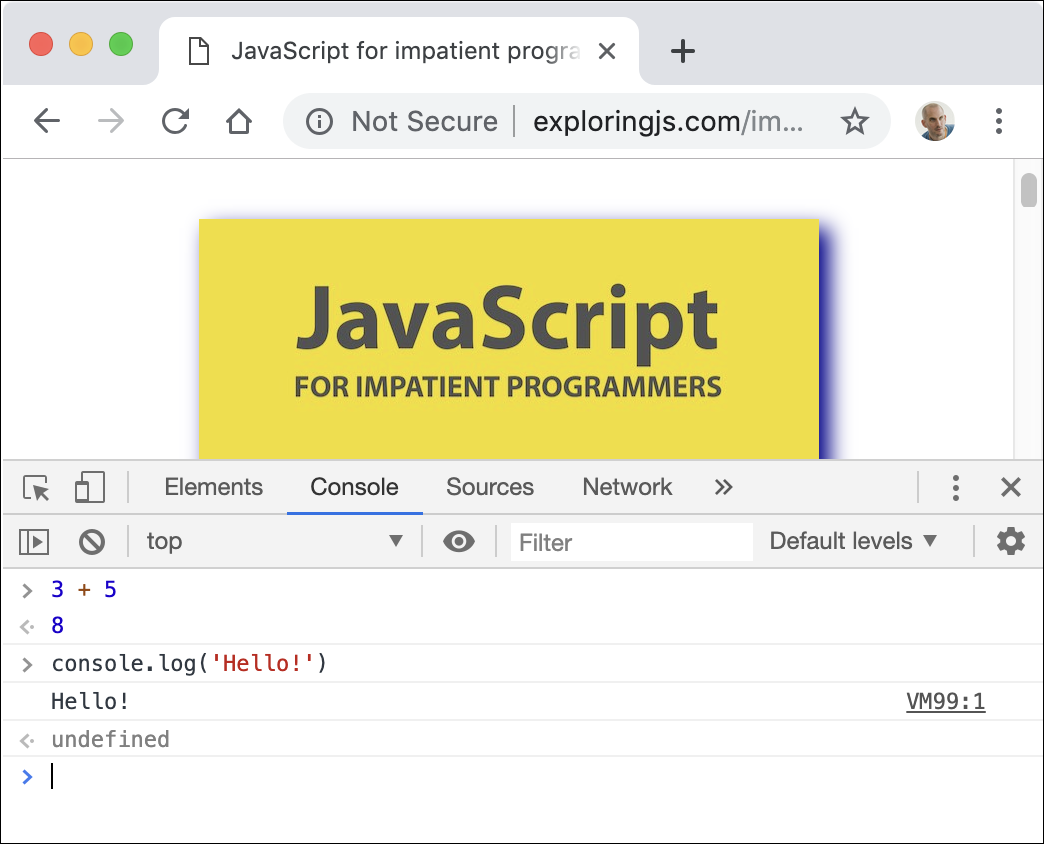 Web browsers have so-called consoles: interactive command lines to which you can print text via console.log() and where you can run pieces of code. How to open the console differs from browser to browser. Figure 10.1 shows the console of Google Chrome.