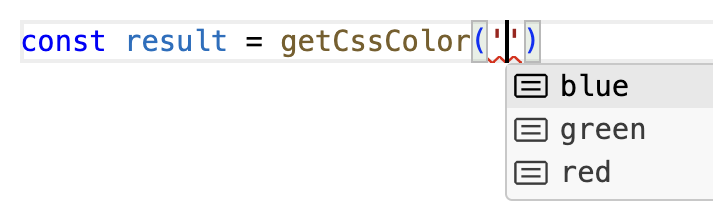 Lastly, TypeScript gives us auto-completion for the argument of getCssColor() (the values 'blue', 'green' and 'red' that we can use for it):