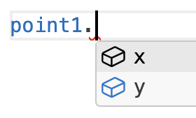 In line A, we get auto-completion after point1. (the properties x and y of that object):